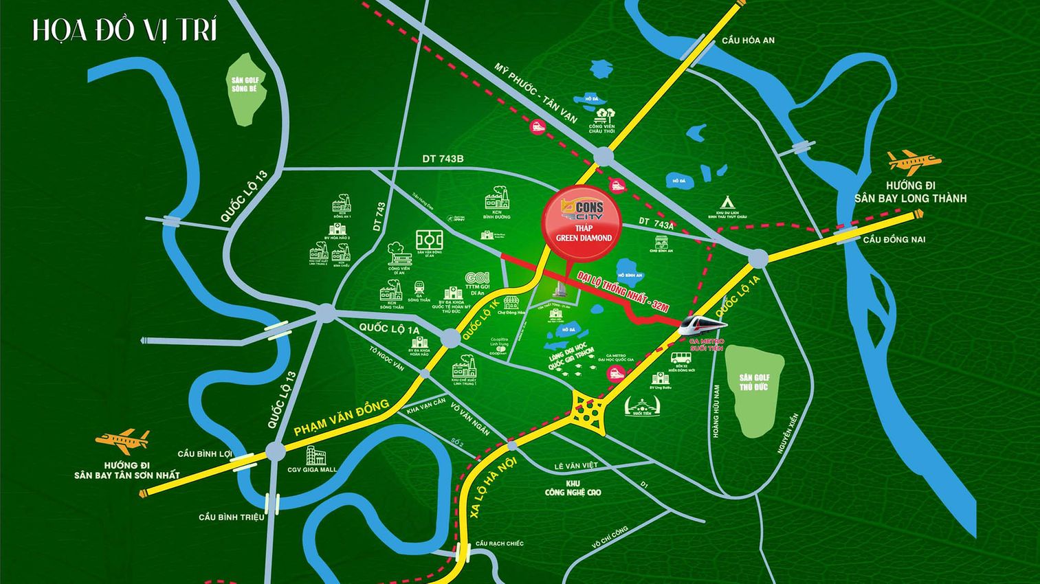 THÁP GREEN DIAMOND nằm trong cụm Bcons City gồm 5 tòa tháp cao 27 tầng đầy đủ tiện ích.